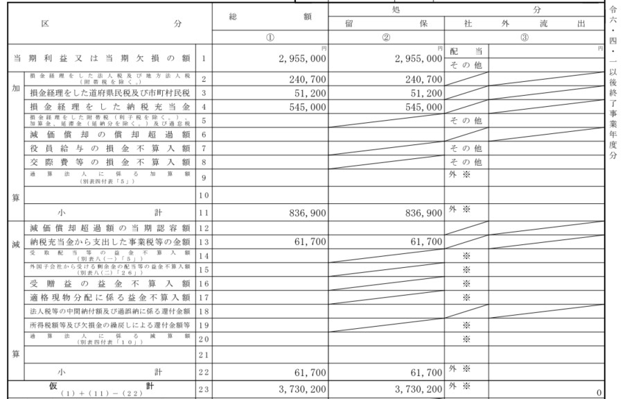 法人税額の計算を行います。上記内容で計算すると別表4は下記のようになります。